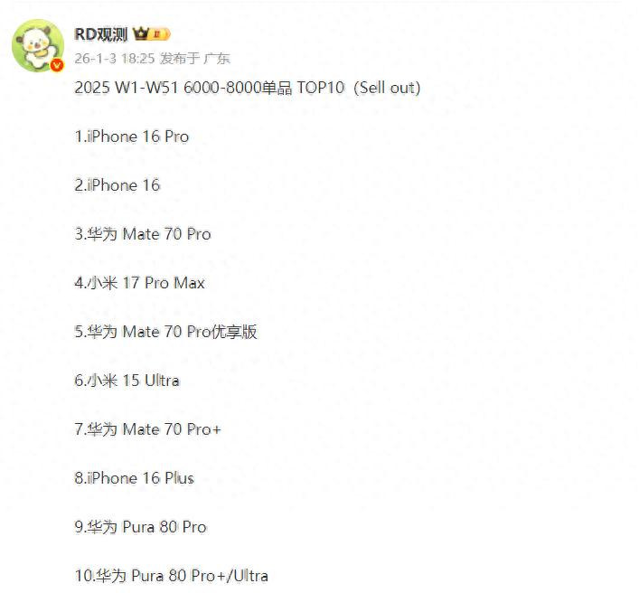 不信大家看行业人士“RD观测”在1月3日提供的国内2025年W1-W51售价6000-8000元市场单品销量榜,根据他提供的数据这一期间单品销量Top10如下: